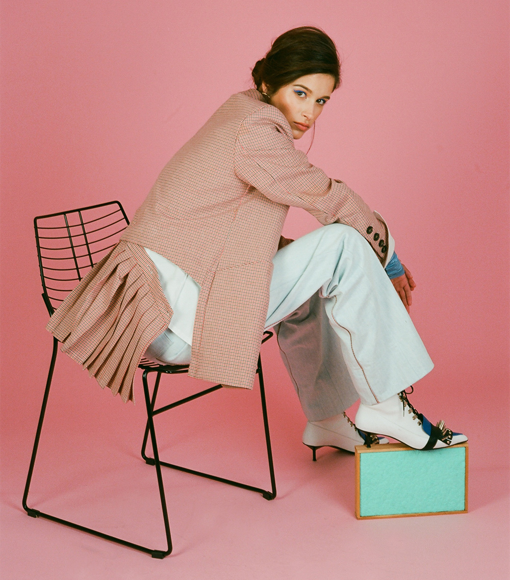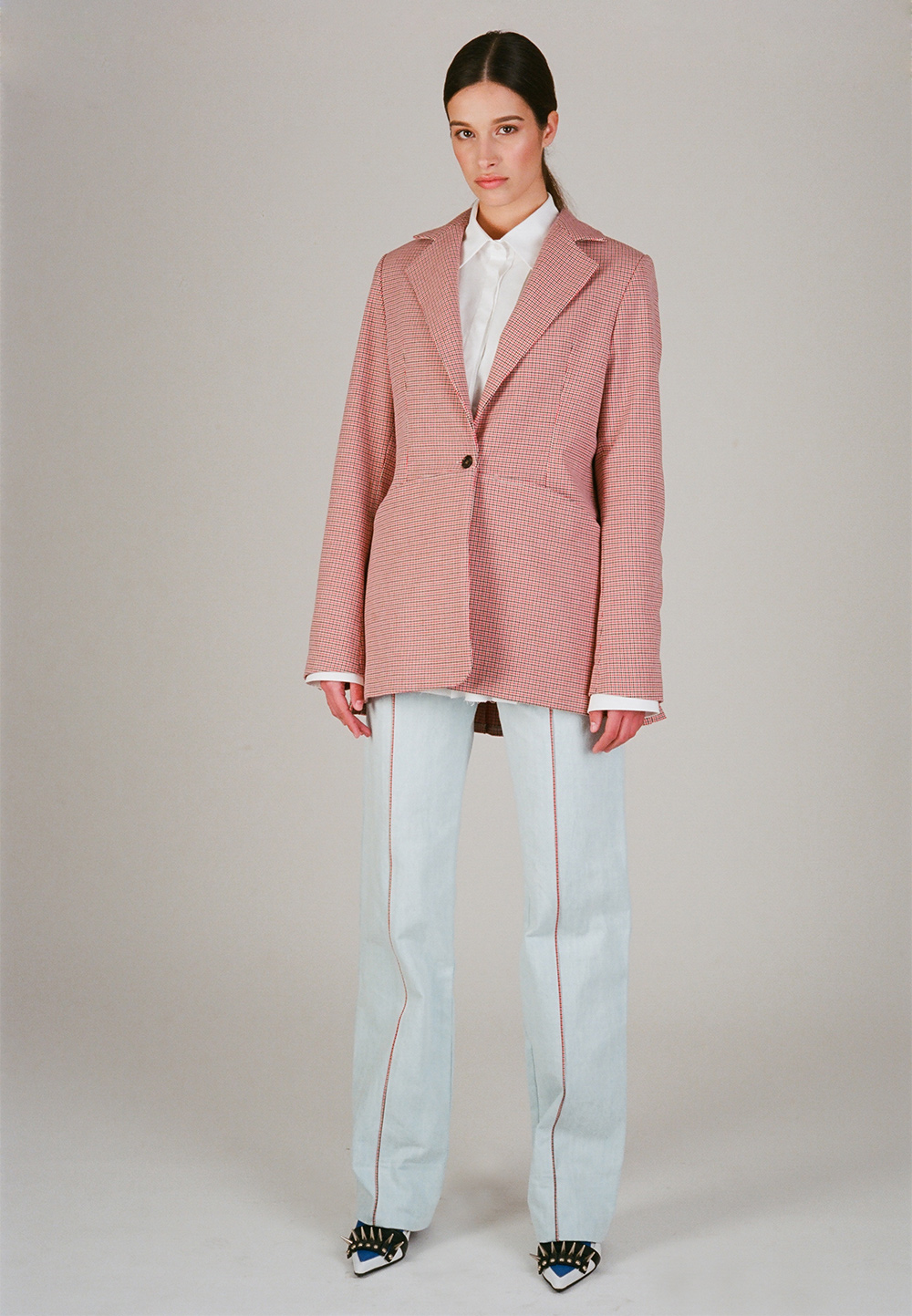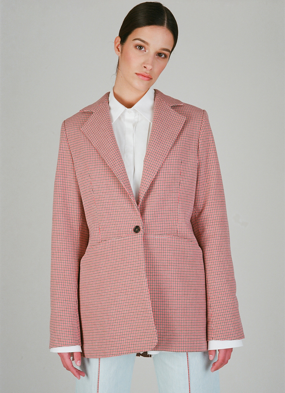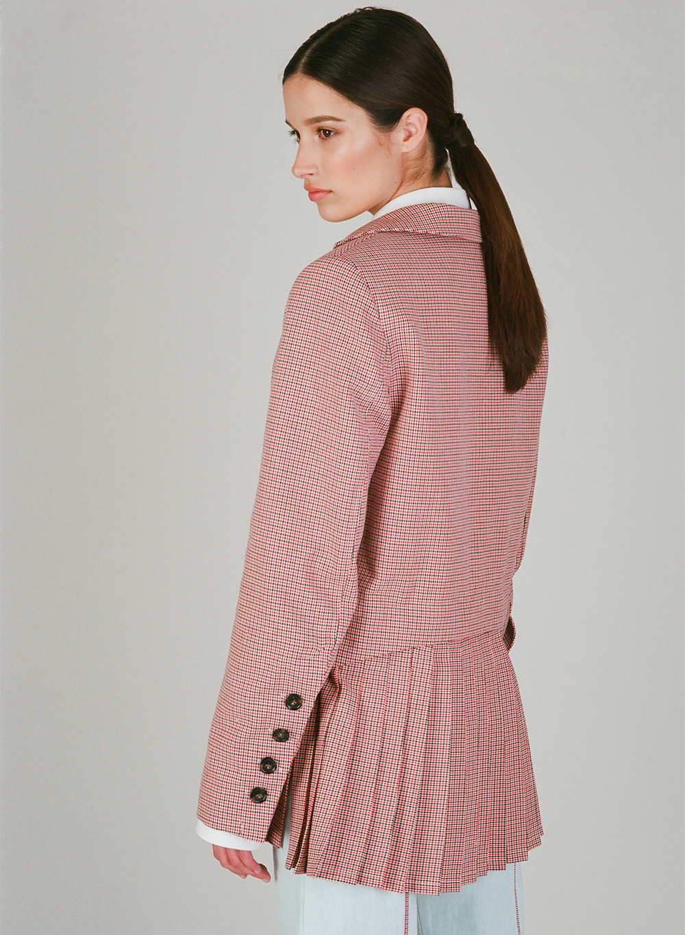 Style details: Pink oversized blazer with interchangeable back cover, longer sleeves, two pockets, shoulder pads, viscose lining. The textured check pattern, buttons on sleeves, and pleated detailing add character to this spring essential.